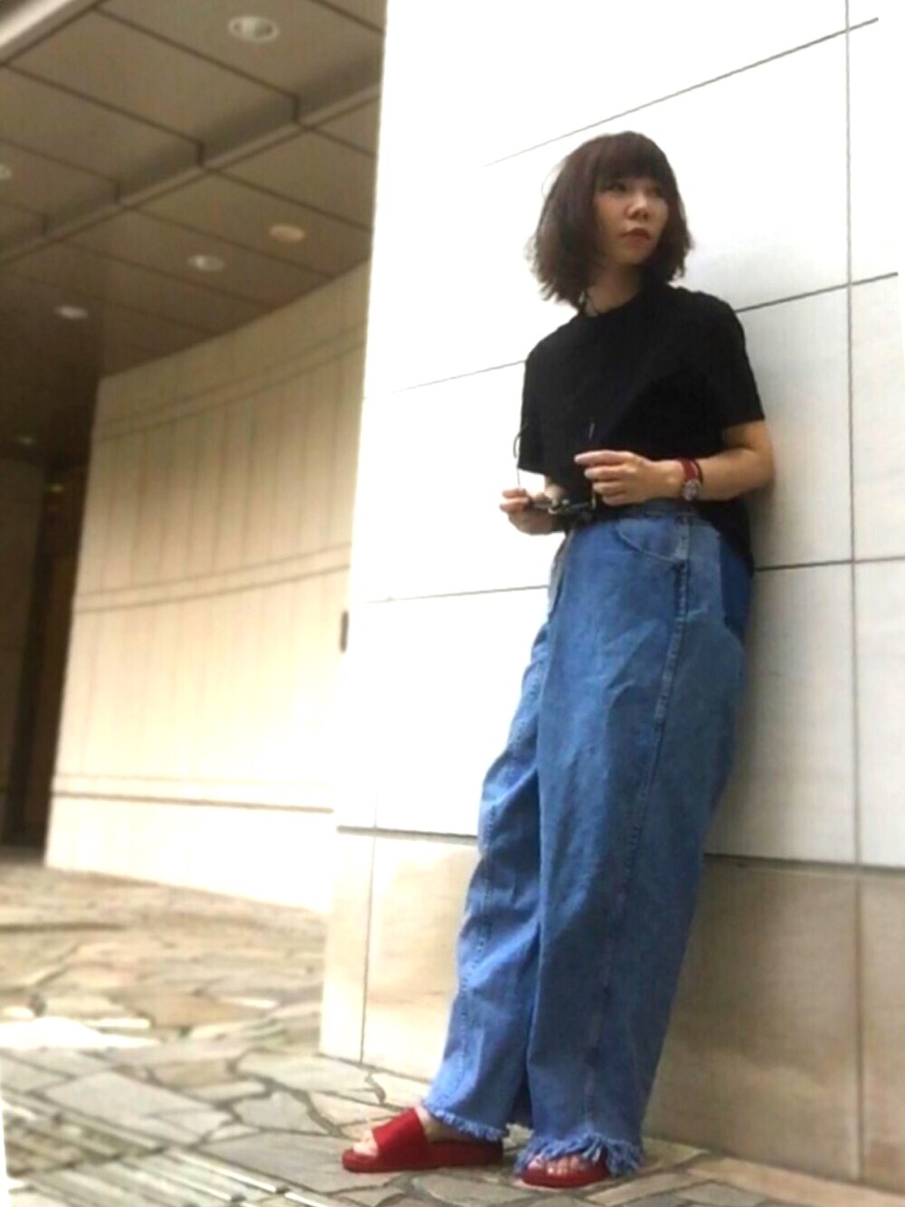 着たい服を着ました😊 黒いTシャツが欲しいと思っていたところ、URUのTシャツがかなり上質で(チョウチョウ綿と聞いた😂)、これはヘビロテ級だなとw 解体再構築のカットオフデニムのフリンジのケバケバがポイントね。 真っ赤なサンダルは新顔でクローゼットに加わったイケメンです🌹赤いサンダルなんて一目惚れだし、このタイプの差し色はきっと便利だなとw (赤いアイテムはリンクしやすい✌️) ところで、 マンション敷地内での撮影は今はオアシスなの。 いつも出張ばかりだから、自宅のここで撮るのが好き。 本当は… 週末まで自宅にいて、毎日友達と会う約束をしてたのに、その願いは虚しく、また明日には出張です😞約束を土壇場でリスケかぁ。 ん〜〜ん〜〜ん〜〜ヾ(#`Д´#)ノ