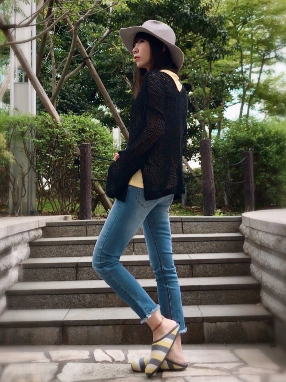EMODAのVネックを後ろ前にして着るコーデ☺️ インナーとレイヤードする時、前は丸襟同士が好きだったりしますw それにこのニットはブラックだけど網だから暑苦しくないです。 背中とスリットでイエローをちらつかせてみました‼️ N.のカットオフデニムは今年も活躍しそうです。