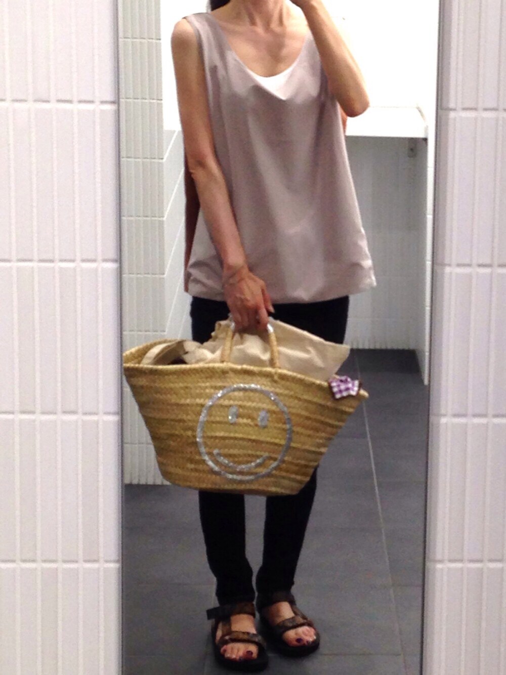 暑くてノースリーブです。カーディガンはカゴへ