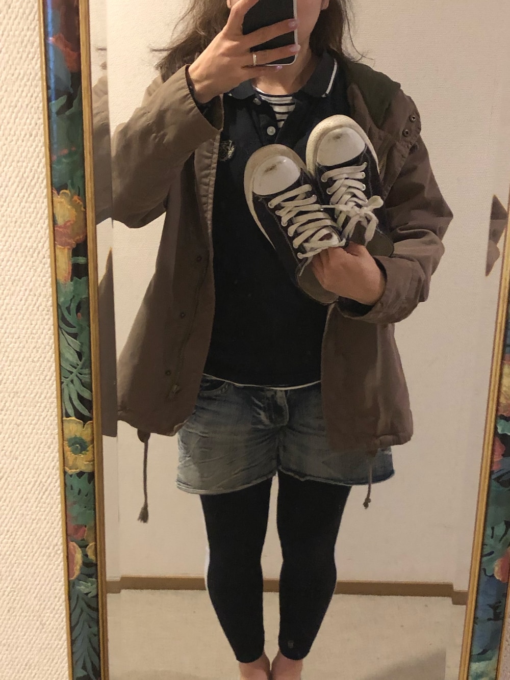 #2019/04/28 #ライン入りリブレギンス #デニムショートパンツ #7部袖ボーダーTシャツ #ポロシャツ #ミリタリージャケット