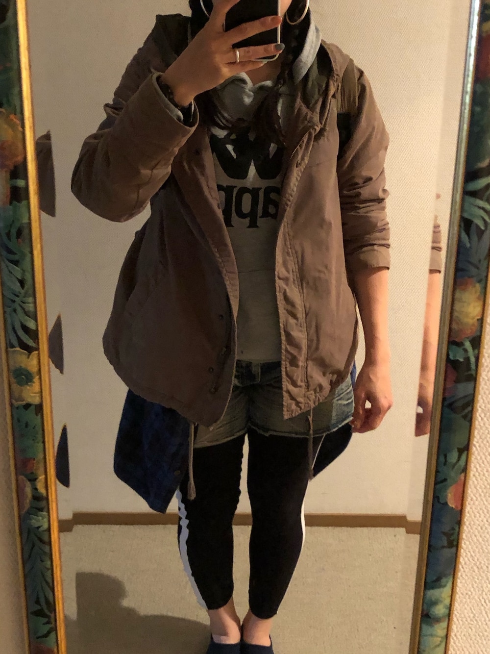#2019/10/16 #デニムショートパンツ #ライン入りレギンス #チェックシャツ #ロゴパーカー #ハーフパンツミリタリージャケット