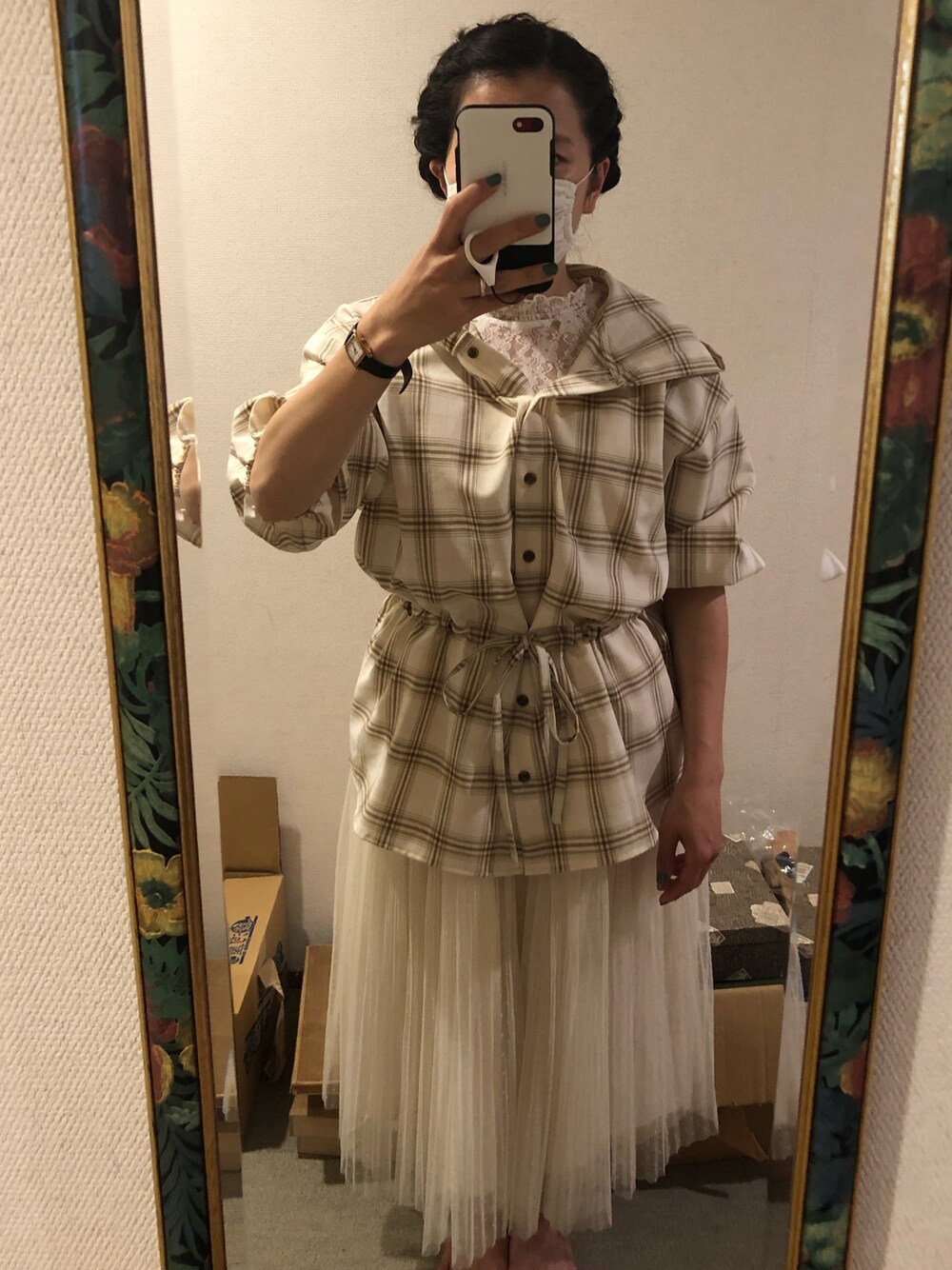 #2020/06/02 #チュールスカート #フード付きチェックシャツ #ハイネックレースタンクトップ