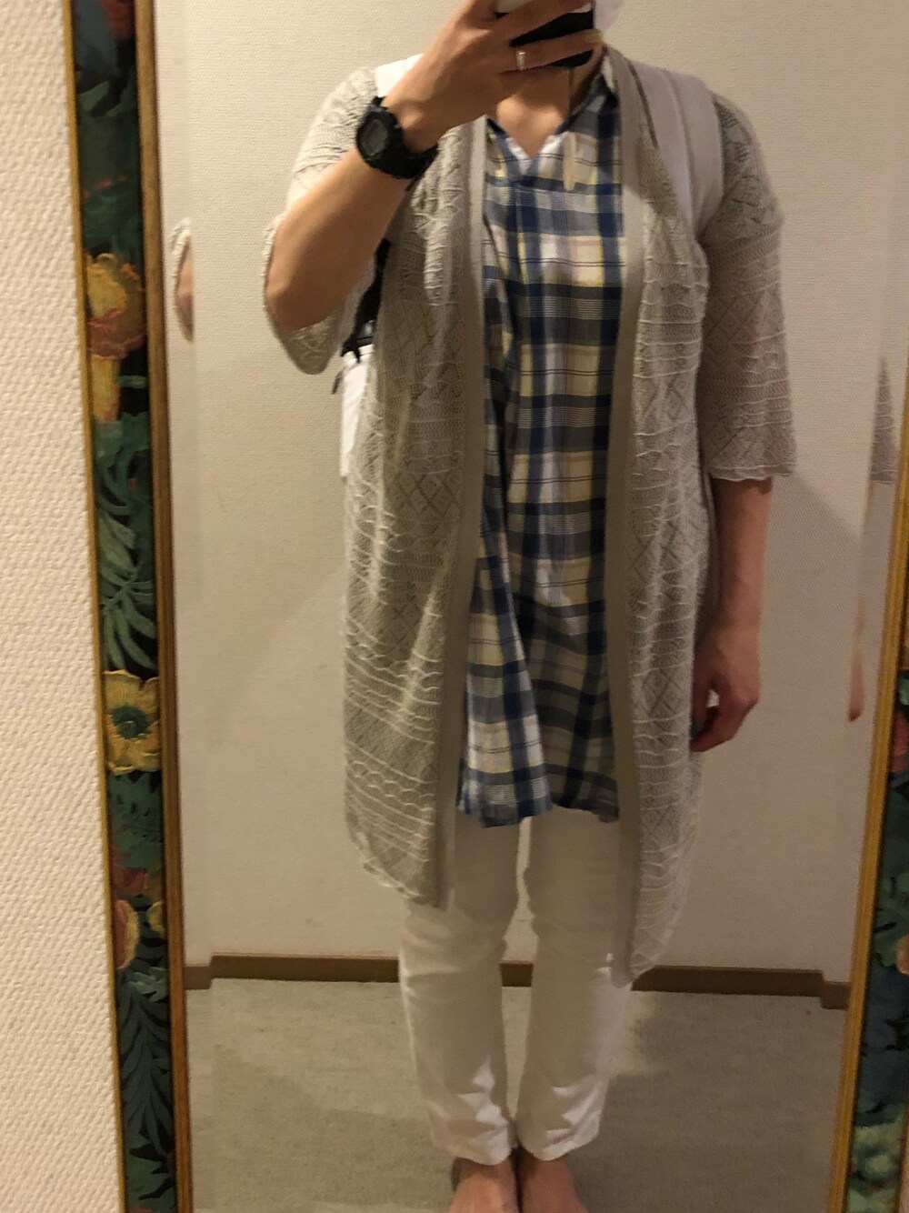 #2020/07/01 #透かしロングカーディガン #チェックチュニックシャツ #スリムスキニーパンツ