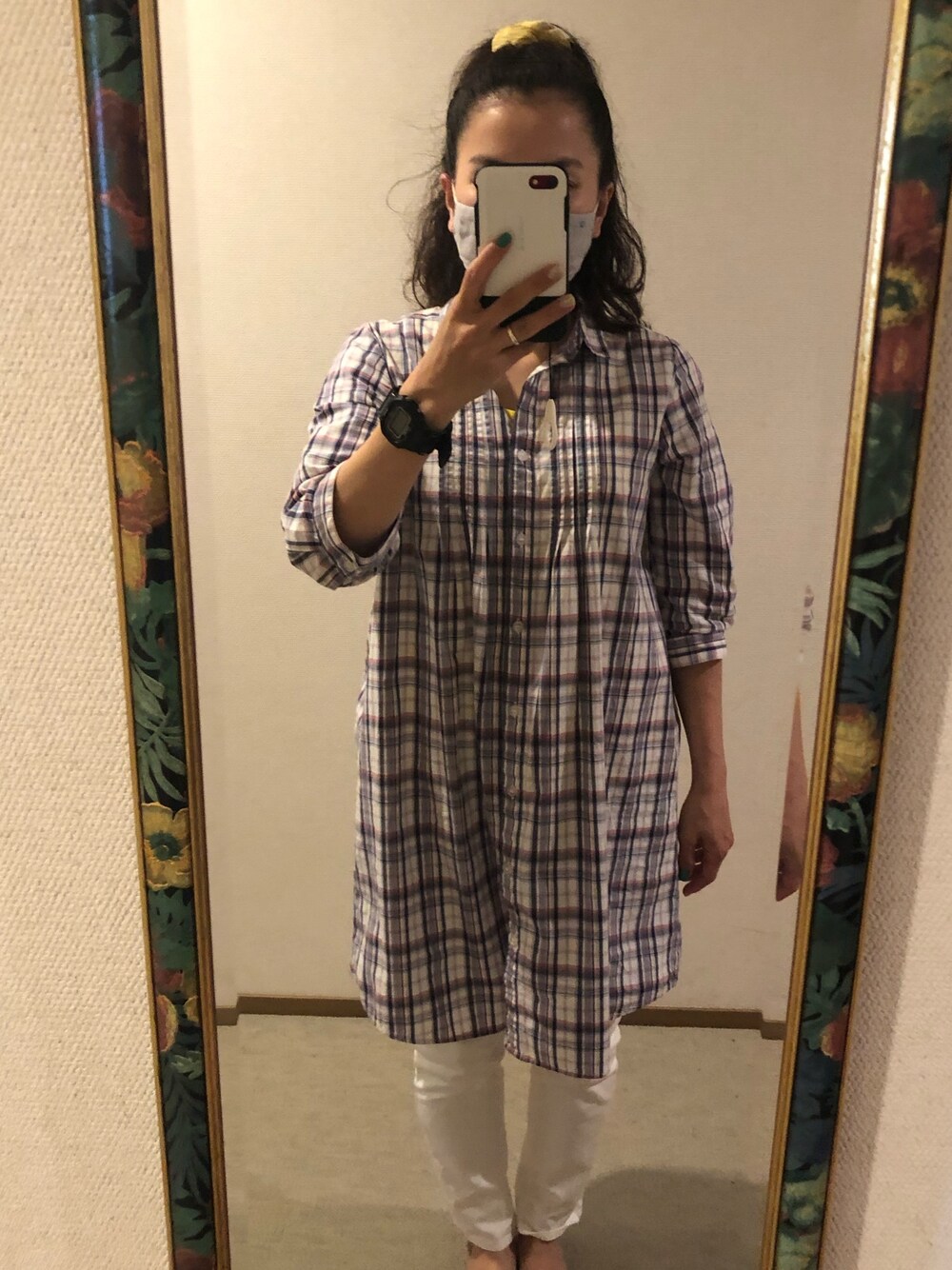 #2020/07/04 #七部袖チェックシャツワンピース #スリムスキニーパンツ