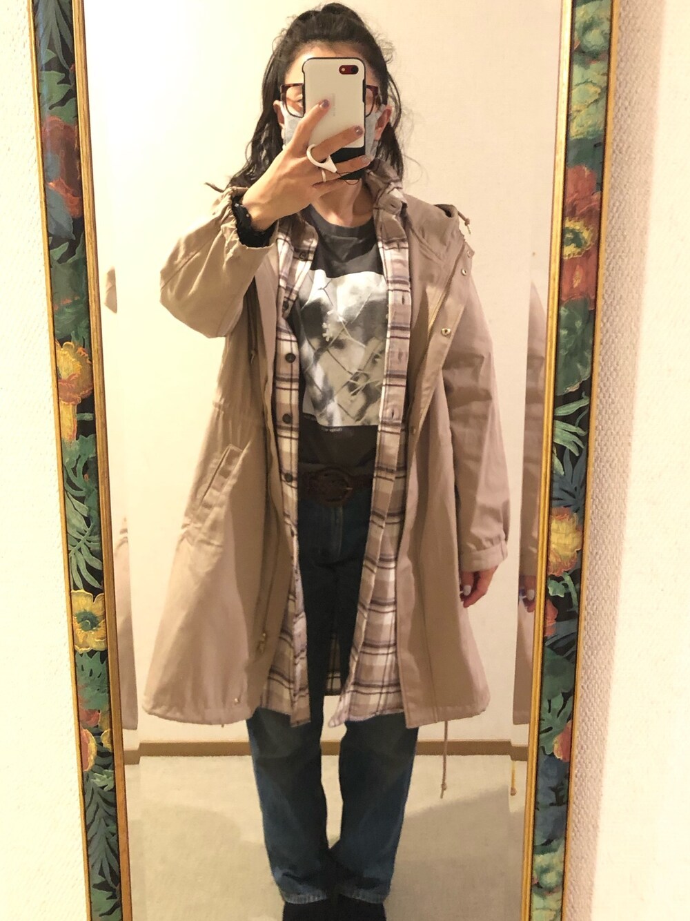 #2020/10/15 #チェックコーデ14日目 #ロングフードコート #チェックシャツワンピース #プリントTシャツ #デニムストレートパンツ
