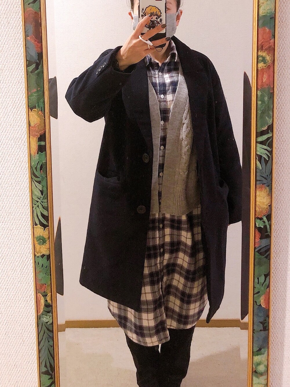 #2020/12/31 #カラースキニーパンツ #ケーブル編みカーディガン #チェックシャツワンピース #チェスターコート