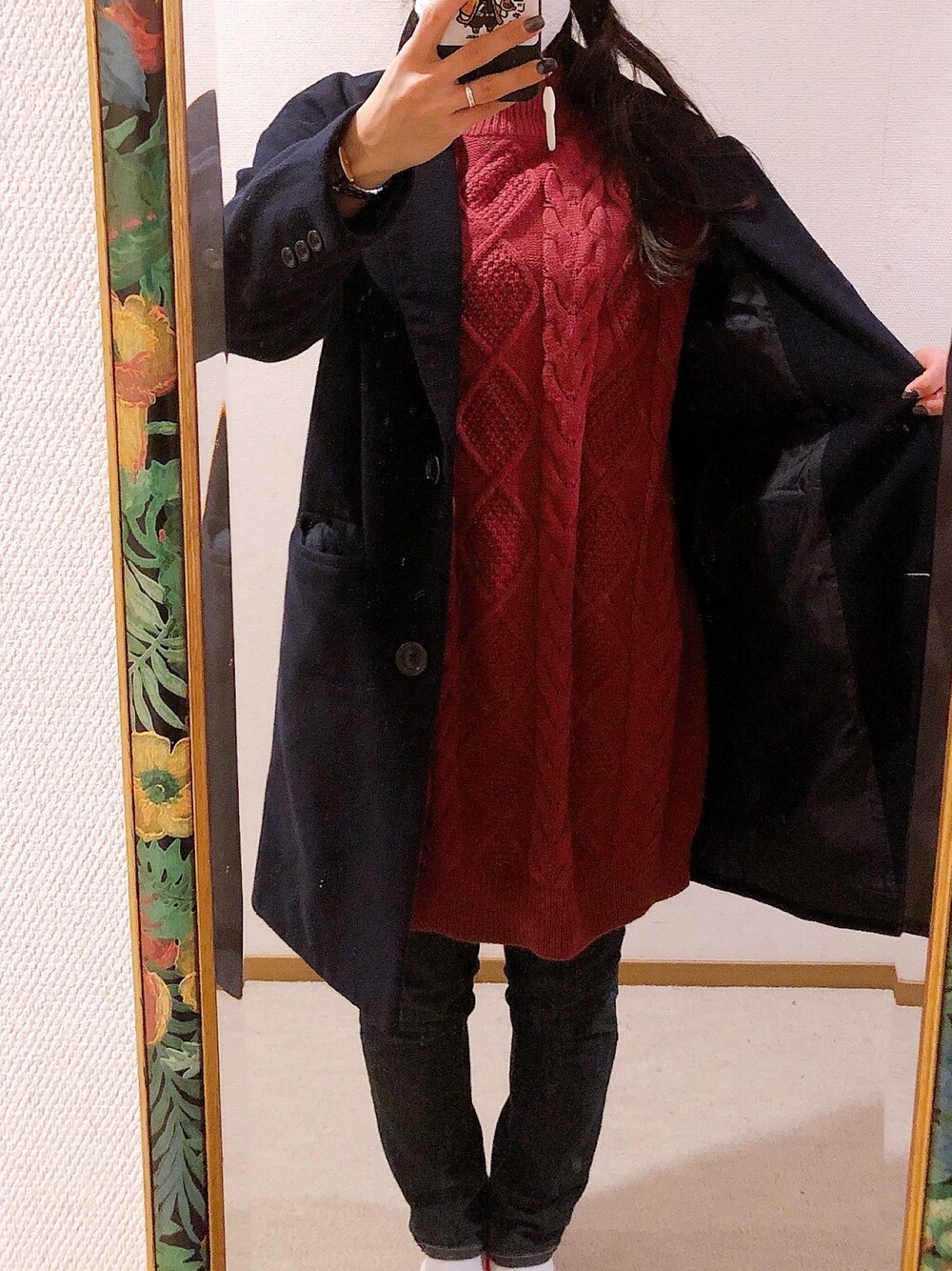 #2021/01/18 #チェスターコート #ケーブル編みチュニック #デニムスキニーパンツ