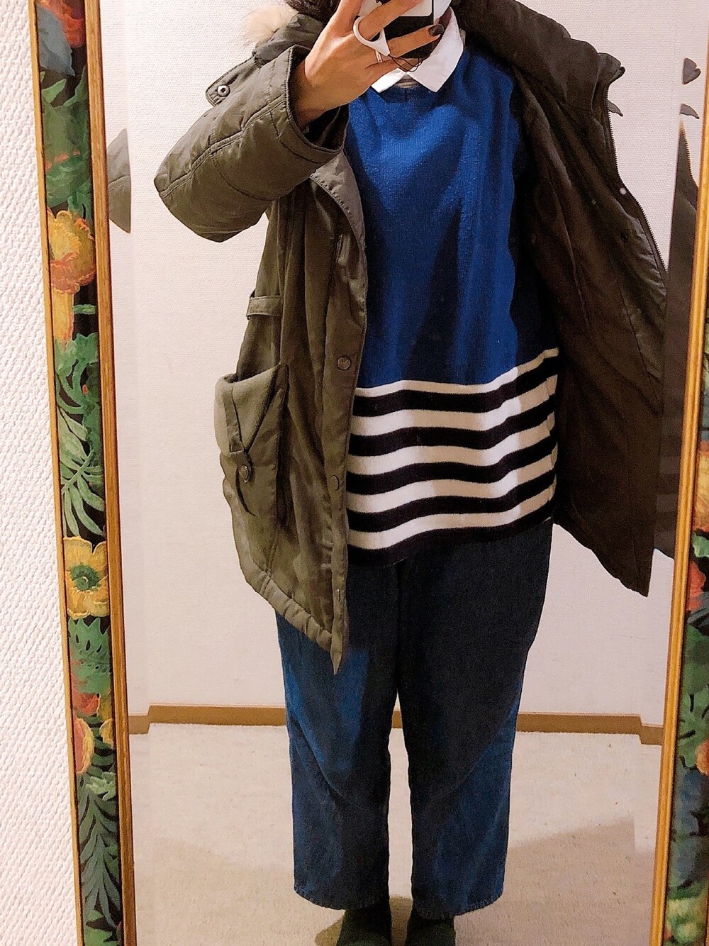 #2021/01/20 #ミリタリージャケット #襟付きカットソー #切り替えニットチュニック #デニムサルエルパンツ