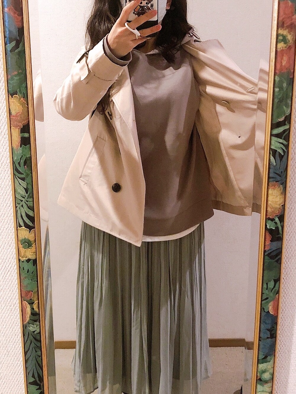 #2021/03/25 #ショートトレンチコート #きれいめパーカー #フォトプリントTシャツ #プリーツスカート