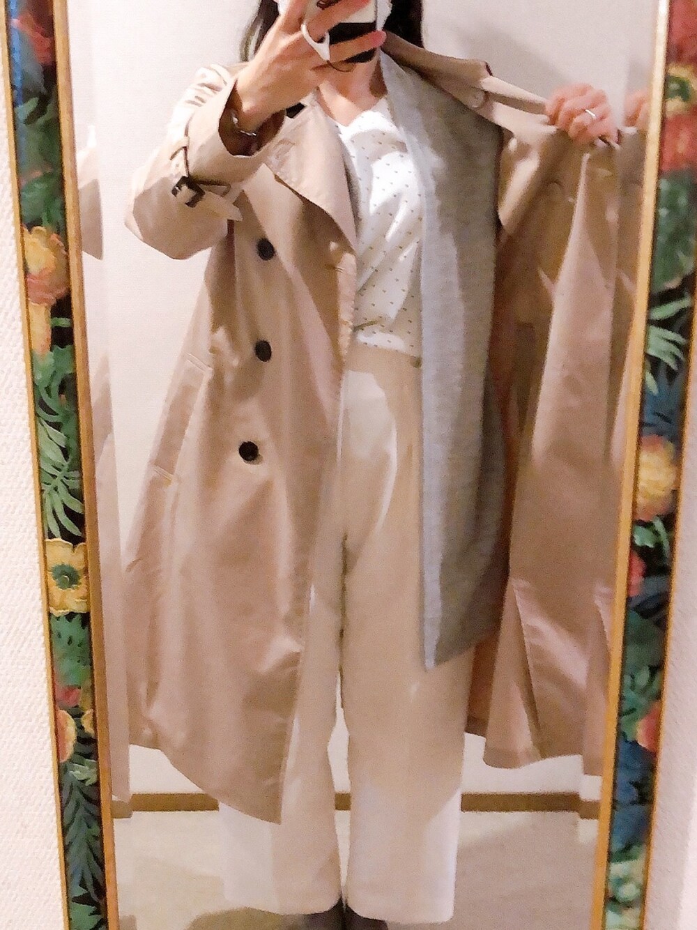 #2021/04/06 #金釦付テーパードパンツ #Vネックブラウス #ロングカーディガン #ロングトレンチコート