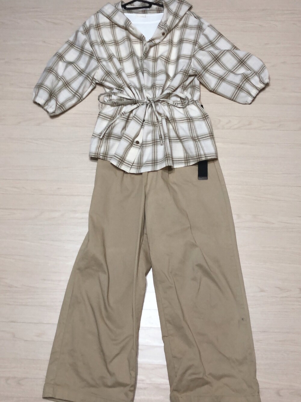 #2021/09/03 #ベルト付きストレートパンツ #フード付きドロストチェックシャツ #ワッフルTシャツ