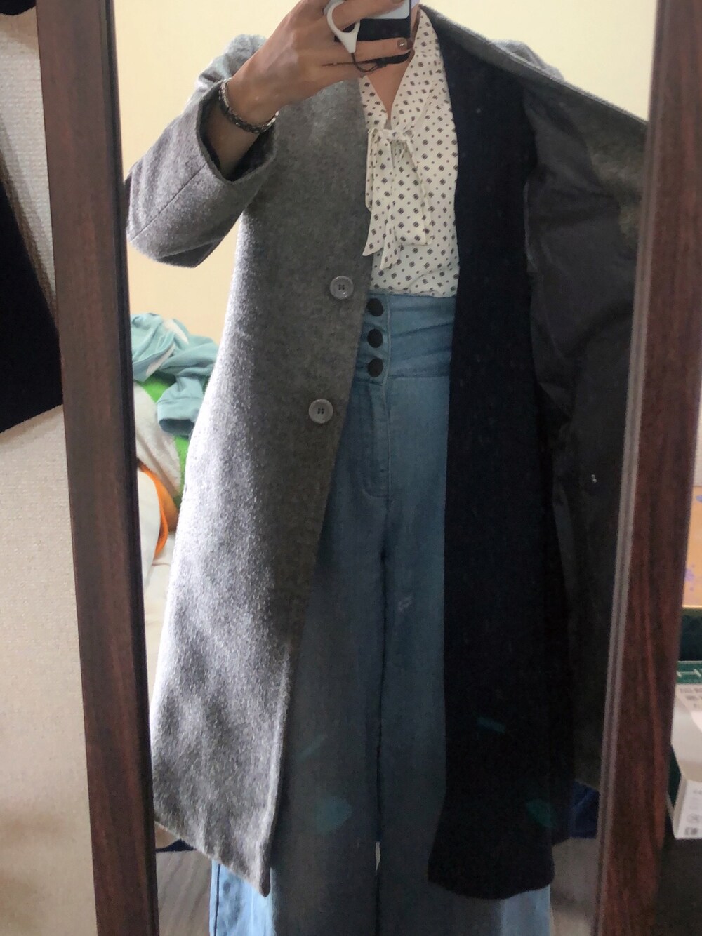 #2022/02/09 #ノーカラージャケット #ボータイブラウス #ロングカーディガン #ハイウエストデニムワイドパンツ