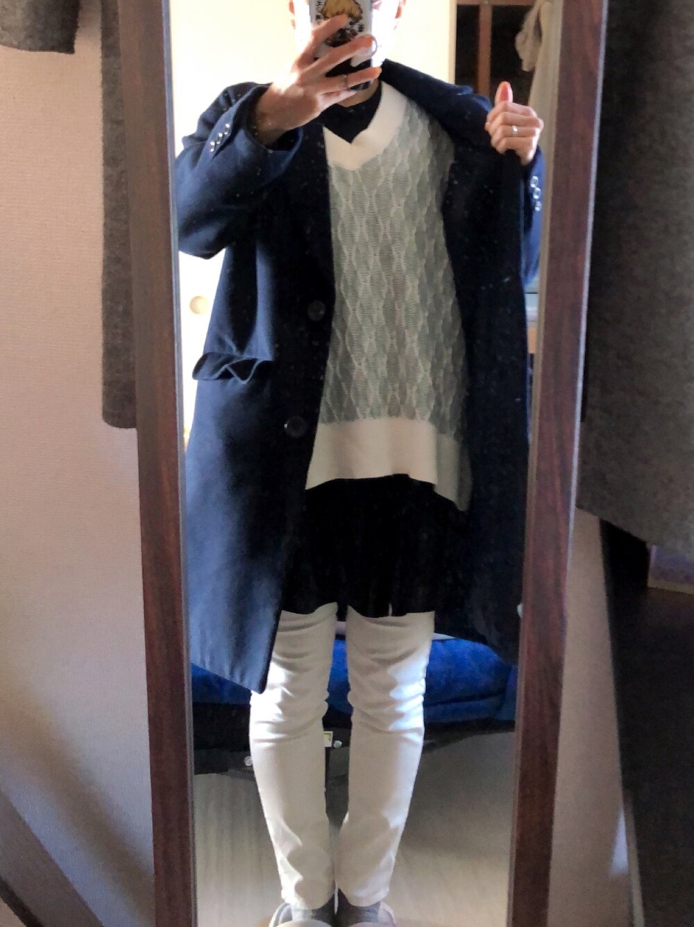 #2022/03/19 #チェスターコート #ニットベスト #ティアードブラウス #カラースキニーパンツ