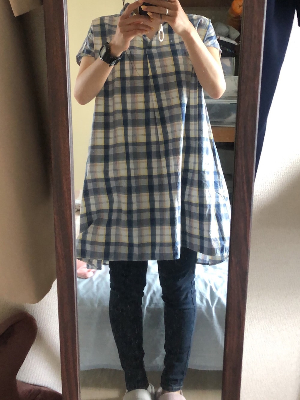 #2022/07/06 #デニムスキニーパンツ #Aラインチュニックチェックシャツ