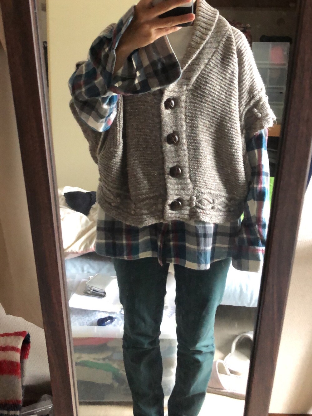 #2022/10/12 #カラースキニーパンツ #ポンチョ #チェックシャツ