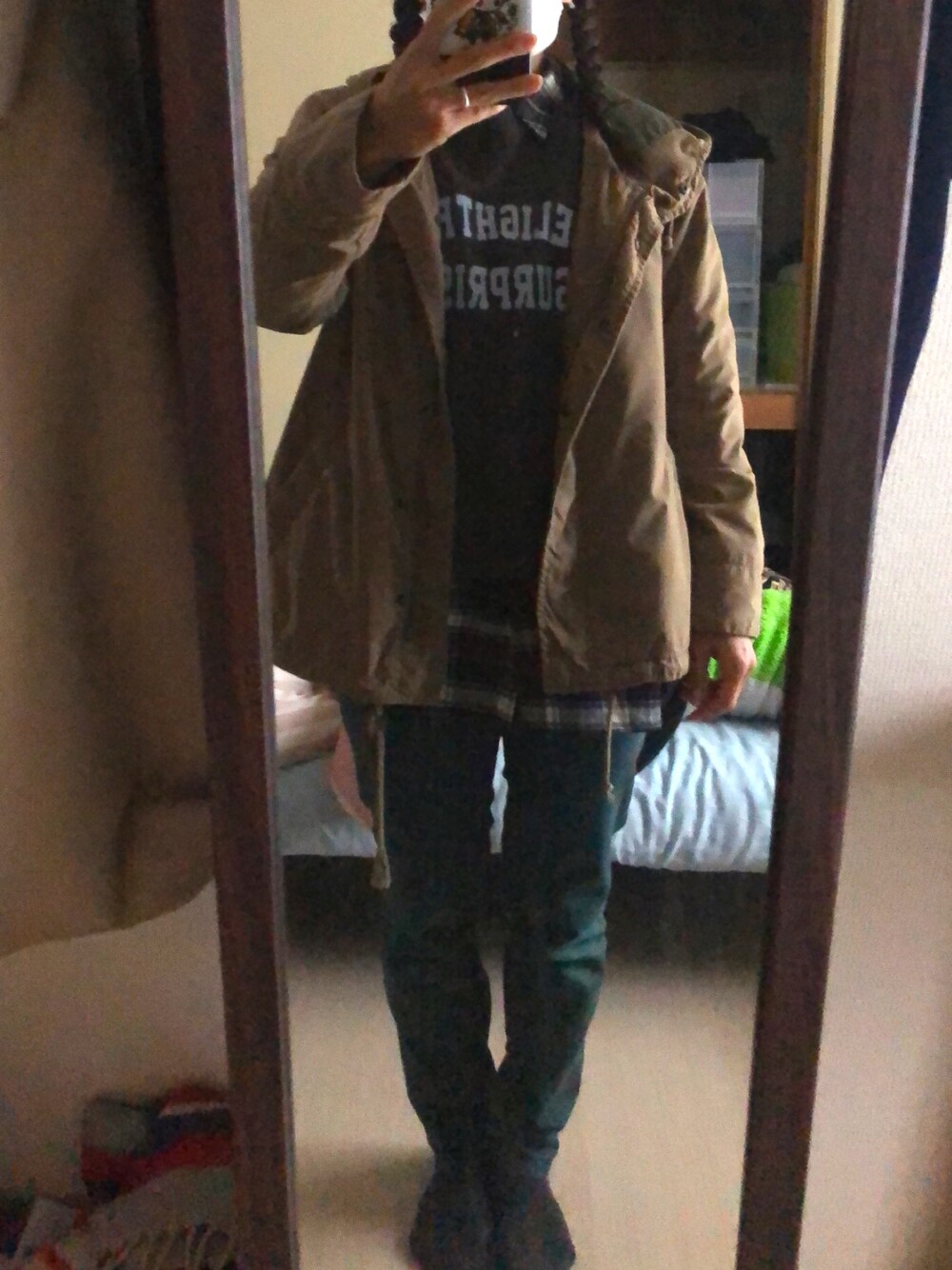 #2022/11/23 #ミリタリージャケット #ロゴトレーナー #チェックチュニックシャツ #カラースキニーパンツ
