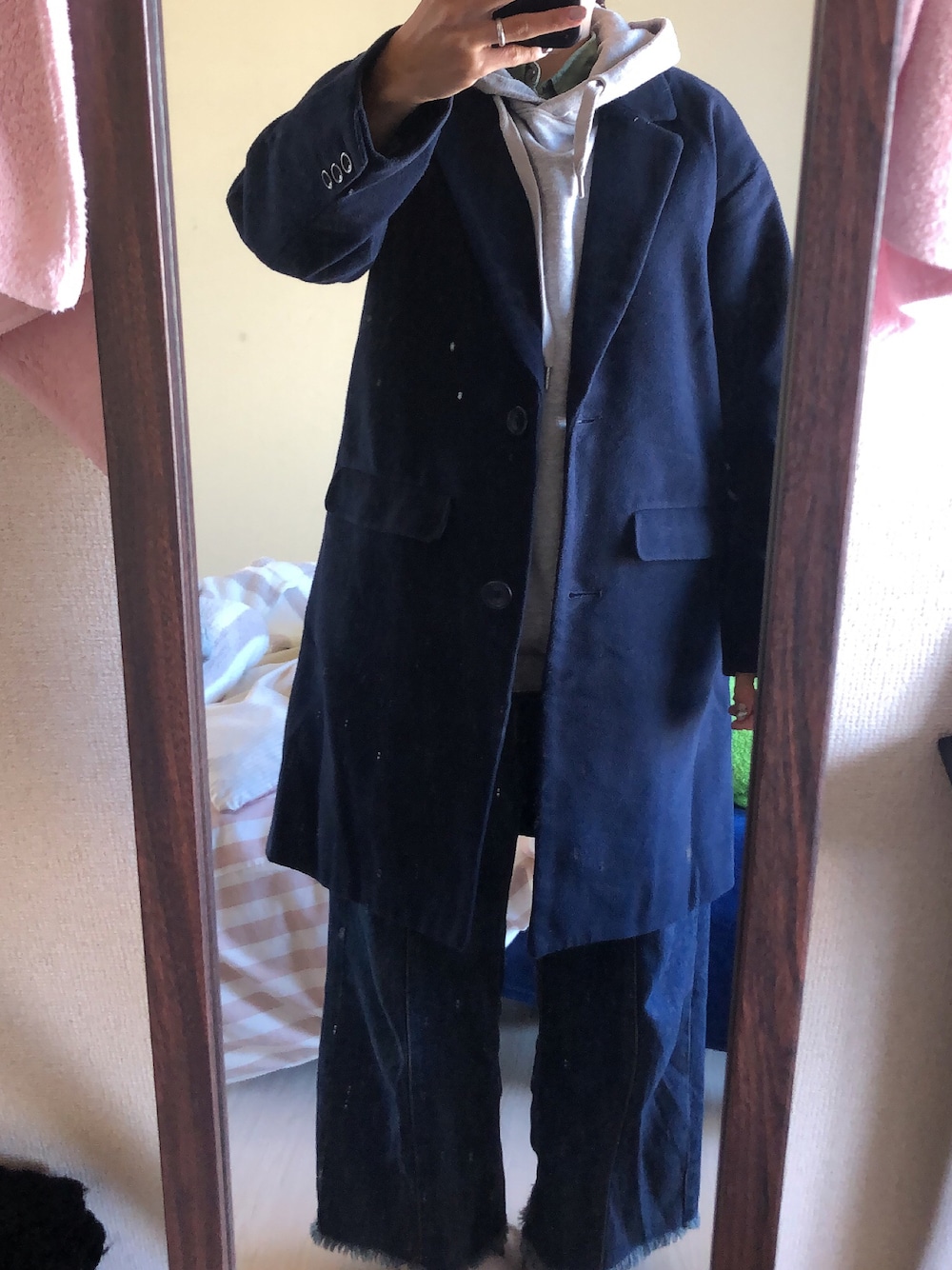 #2022/12/28 #フリンジワイドパンツ #カラーシャツ #ゆるパーカー #チェスターコート