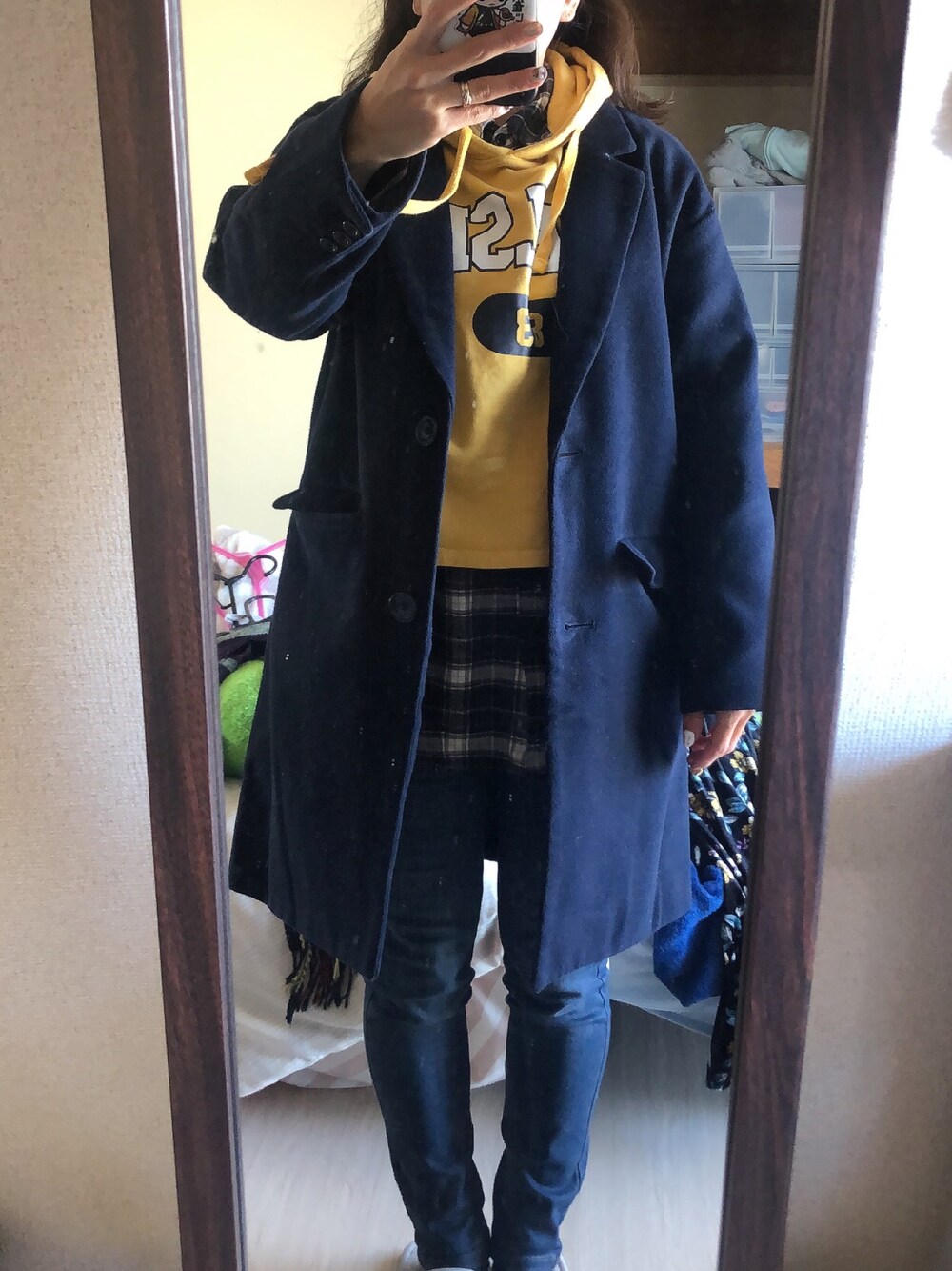#2023/01/10 #チェスターコート #ロゴパーカー #チェックシャツ #暖デニムスキニーパンツ