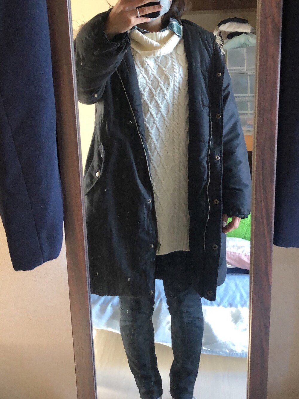 #2023/01/13 #リバーシブルミリタリージャケット #チェックシャツ #オフタートルニットワンピース #カラースキニーパンツ