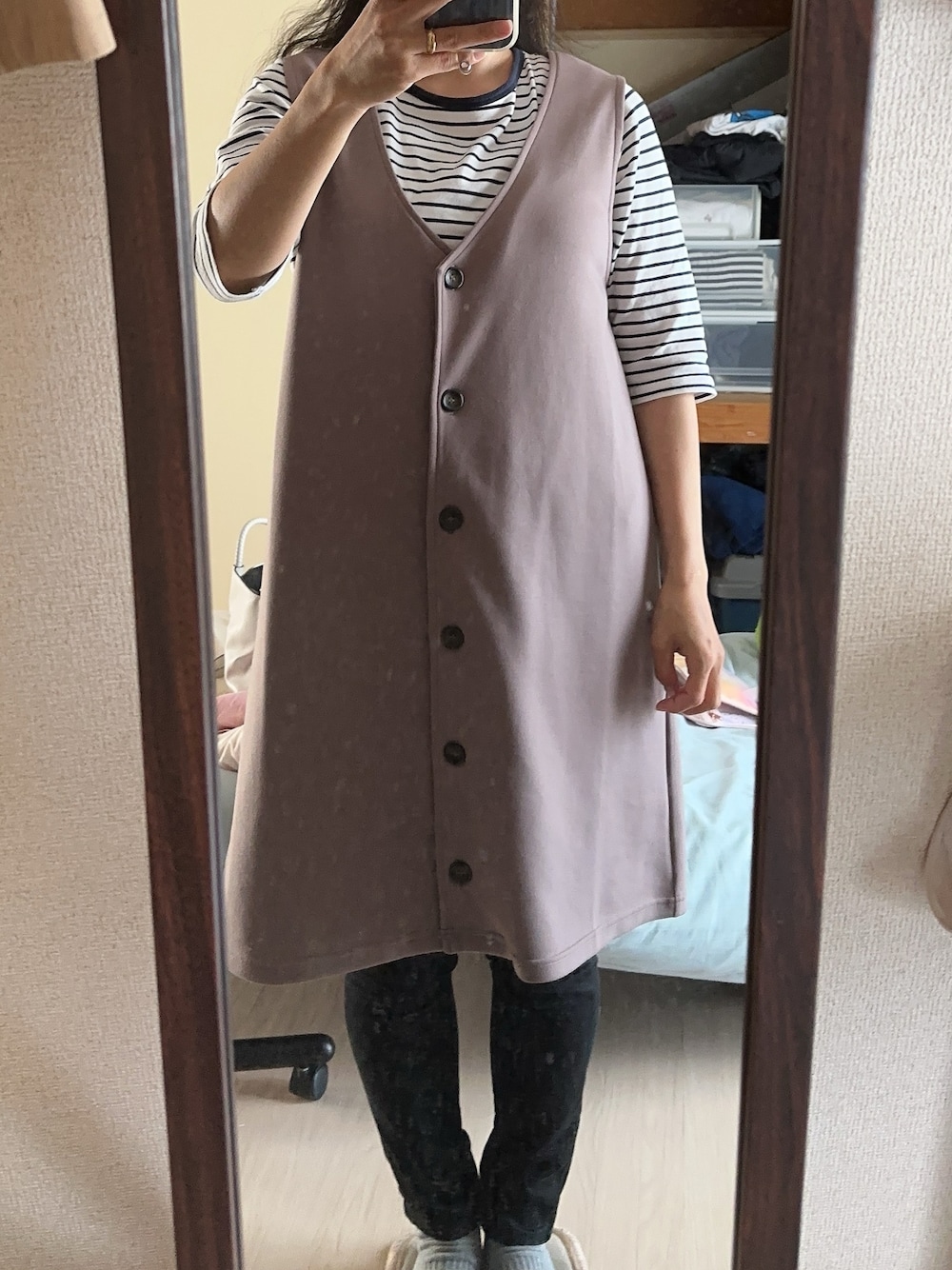 #2023/10/14 #七部袖ボーダーTシャツ #前ボタンジャンスカ #カラースキニーパンツ