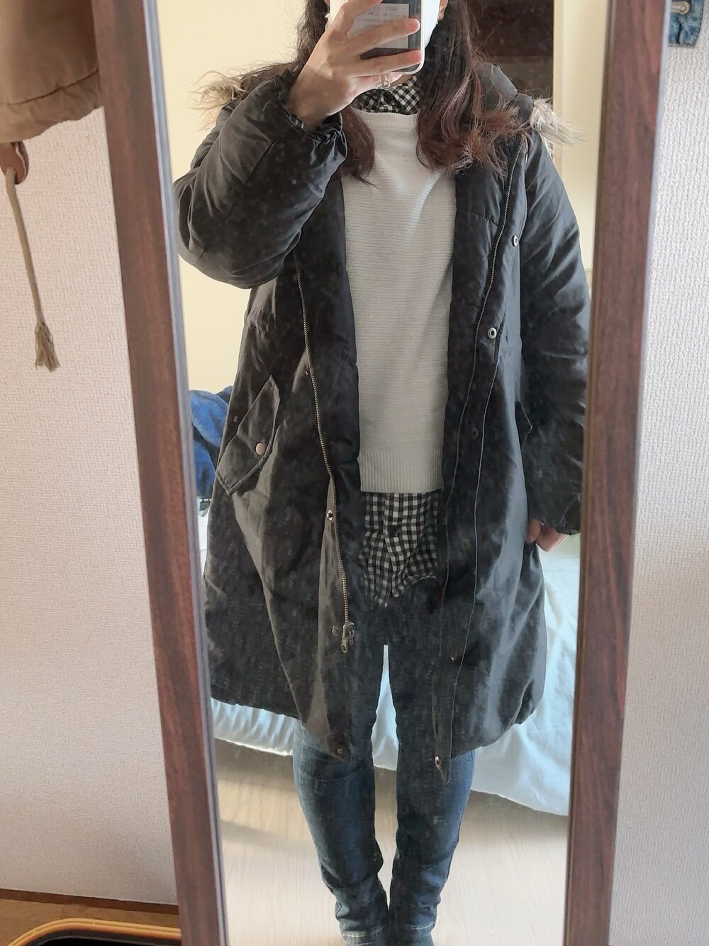 #2023/11/20 #デニムスキニーパンツ #チェックチュニックシャツ #ニットプルオーバー #リバーシブルミリタリージャケット