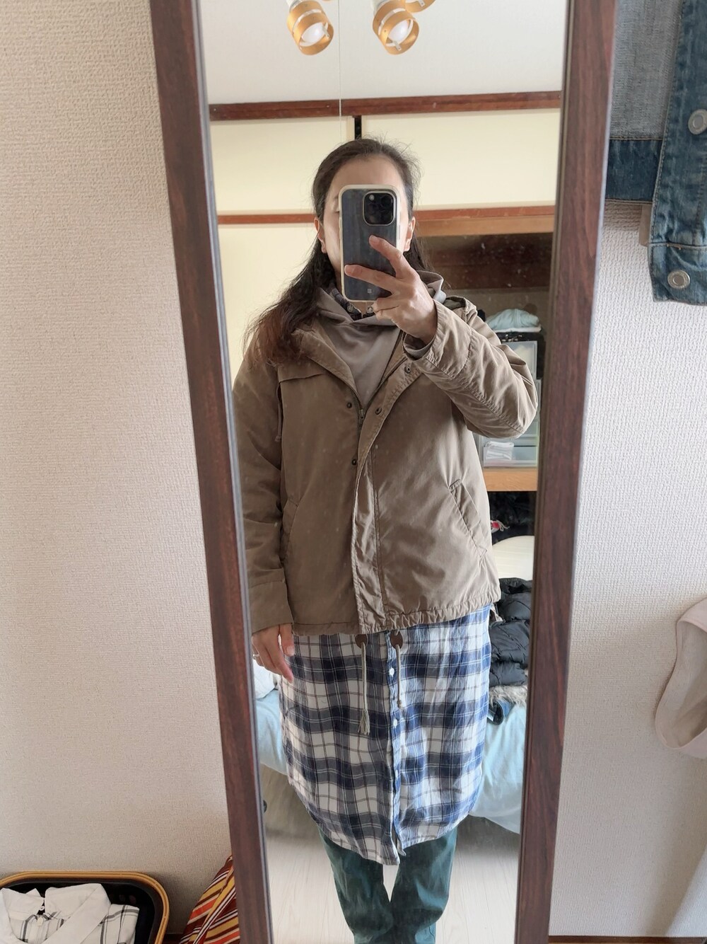 #2023/12/01 #カラースキニーパンツ #チェックシャツワンピース #きれいめパーカー #ミリタリージャケット