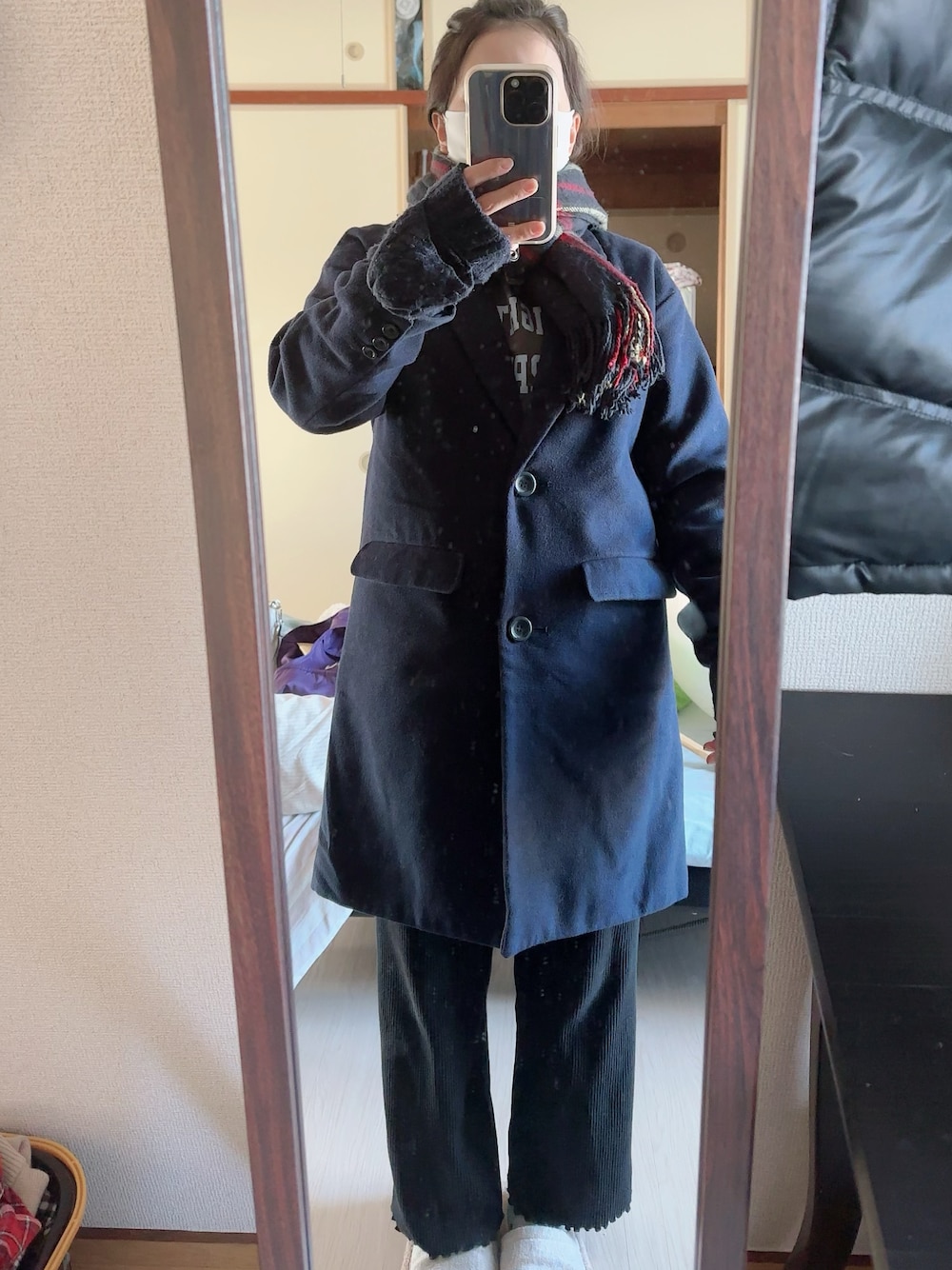 #2023/12/26 #プリーツパンツ #ロゴトレーナー #総レースハイネックプルオーバー #チェスターコート