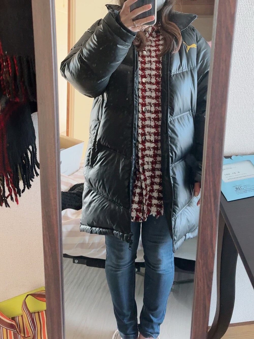 #2024/01/09 #暖デニムスキニーパンツ #七部袖Tシャツ #ツイードシャツジャケット #ロングダウンコート