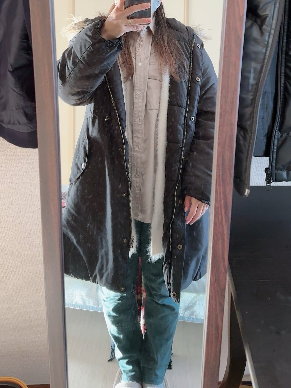#2024/01/27 #カラースキニーパンツ #サテンシャツ #ファーロングカーディガン #リバーシブルミリタリージャケット