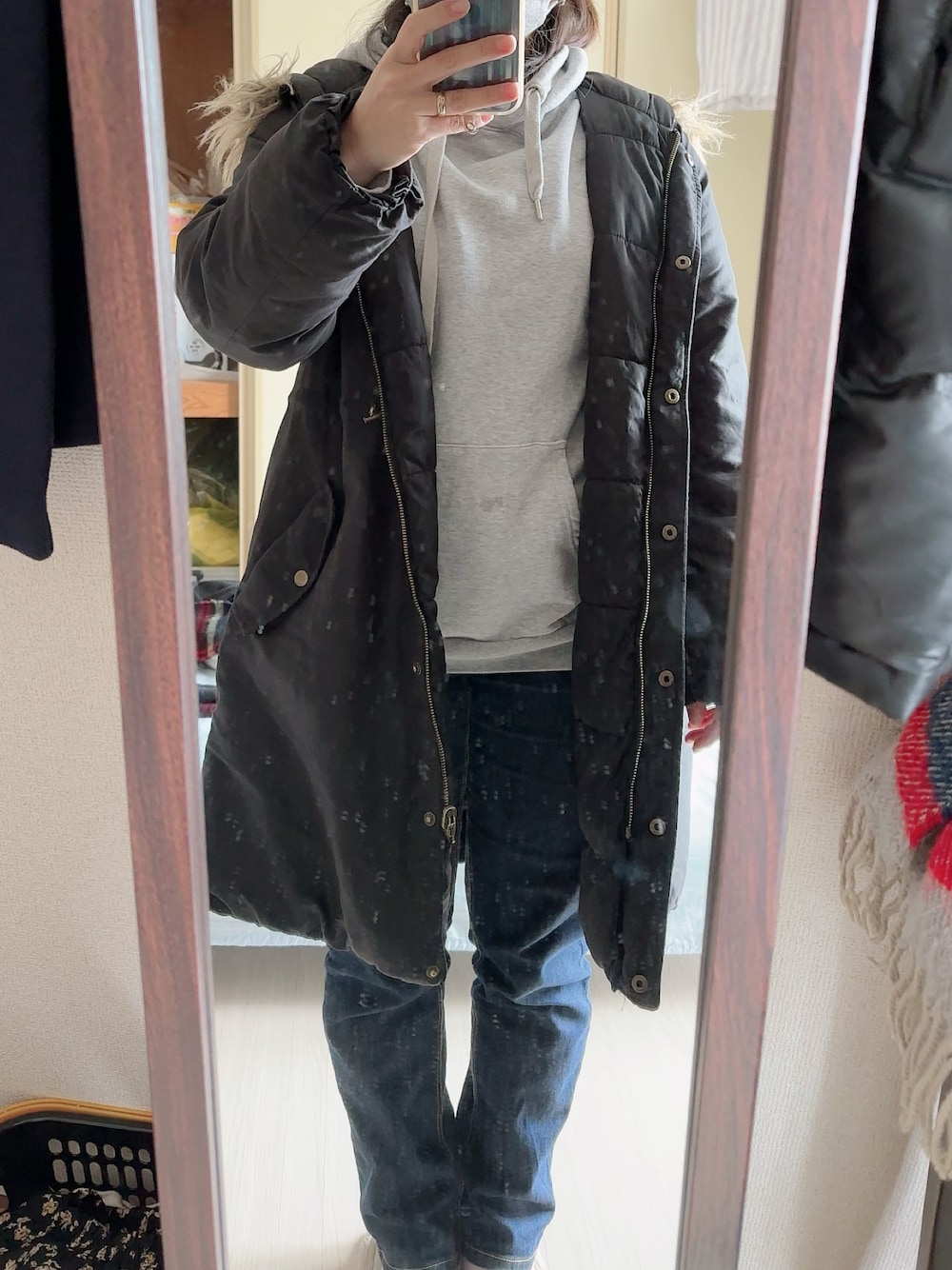 #2024/02/06 #デニムテーパードパンツ #ゆるパーカー #総レースハイネックプルオーバー #リバーシブルミリタリージャケット