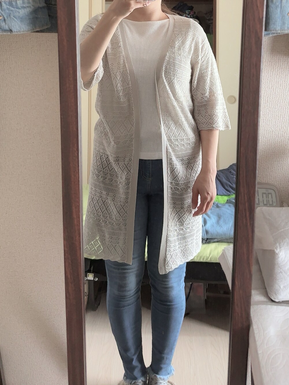#フリンジスキニーパンツ #ワッフルTシャツ #透かし編みロングカーディガン