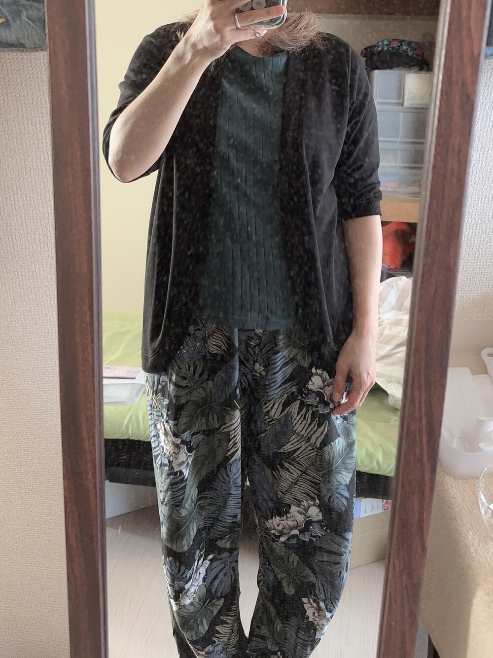 #柄パンツ #ハイネックリブ5部袖Tシャツ #ラウンドカーディガン