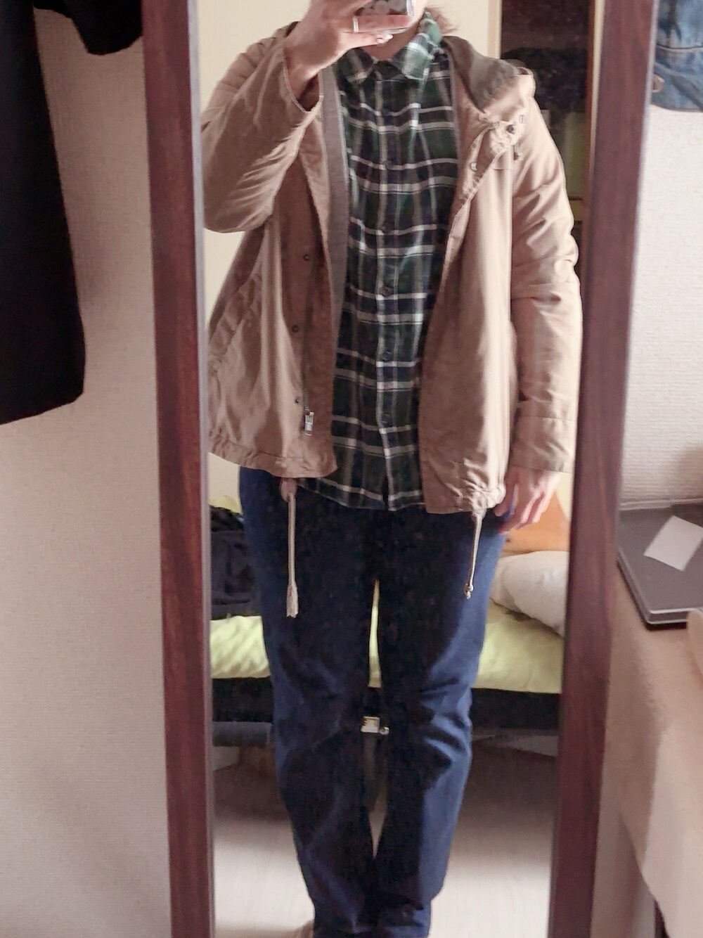 #デニムテーパードパンツ #チェックシャツ #ケーブル編みカーディガン #ミリタリージャケット