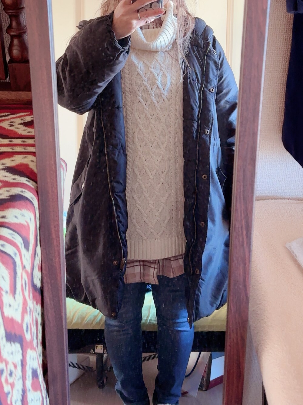 #暖デニムスキニーパンツ #チェックシャツワンピース #オフタートルネックワンピース #リバーシブルミリタリージャケット