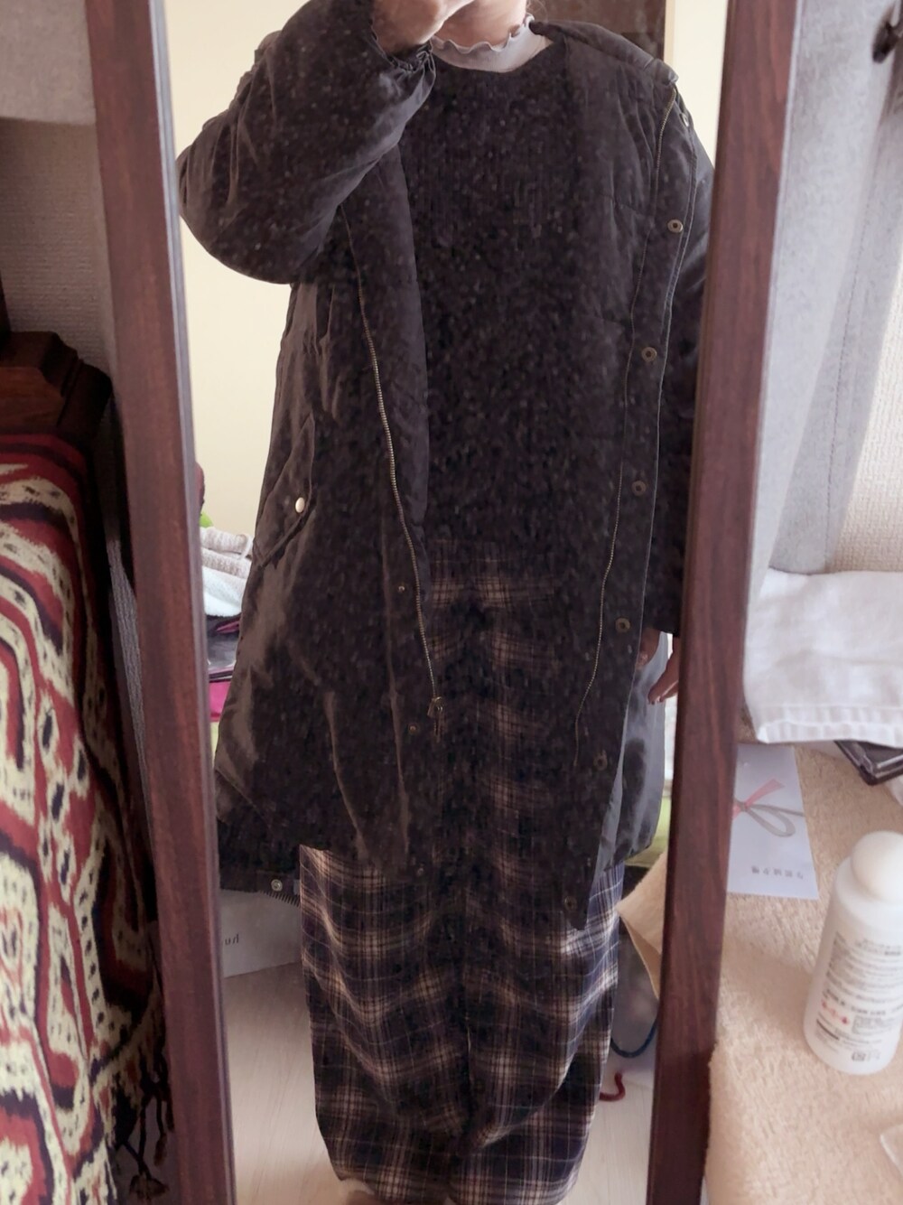 #チェックパンツ #ハイネックメローTシャツ #袖配色ファーニット #リバーシブルミリタリージャケット