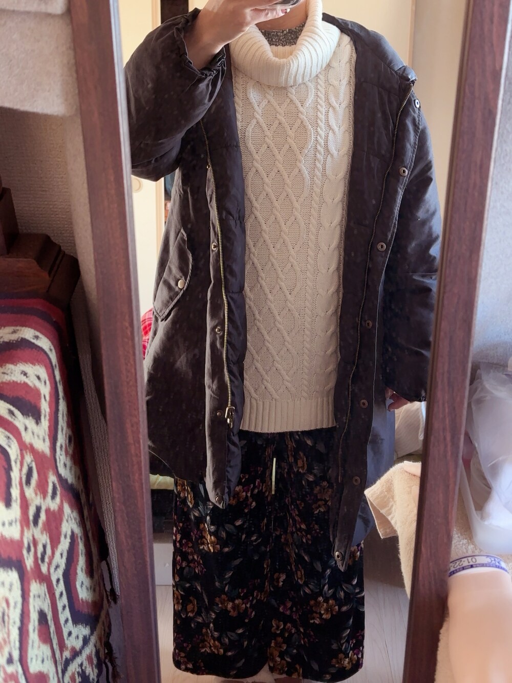 #花柄ベロアパンツ #オフタートルニットワンピース #ハイネックブラウス #リバーシブルミリタリージャケット
