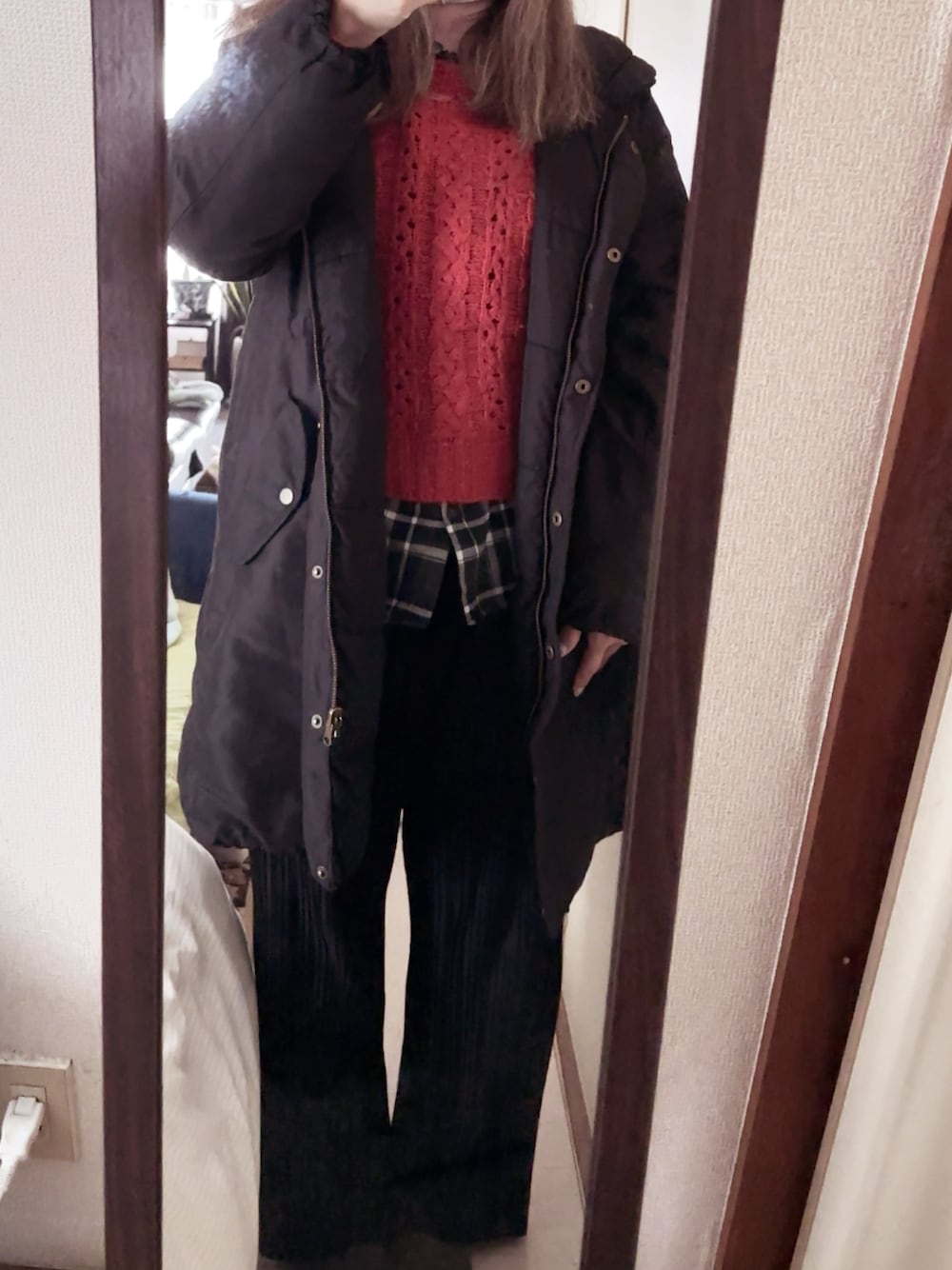 #プリーツパンツ #チェックシャツ #ニットプルオーバー #リバーシブルミリタリージャケット
