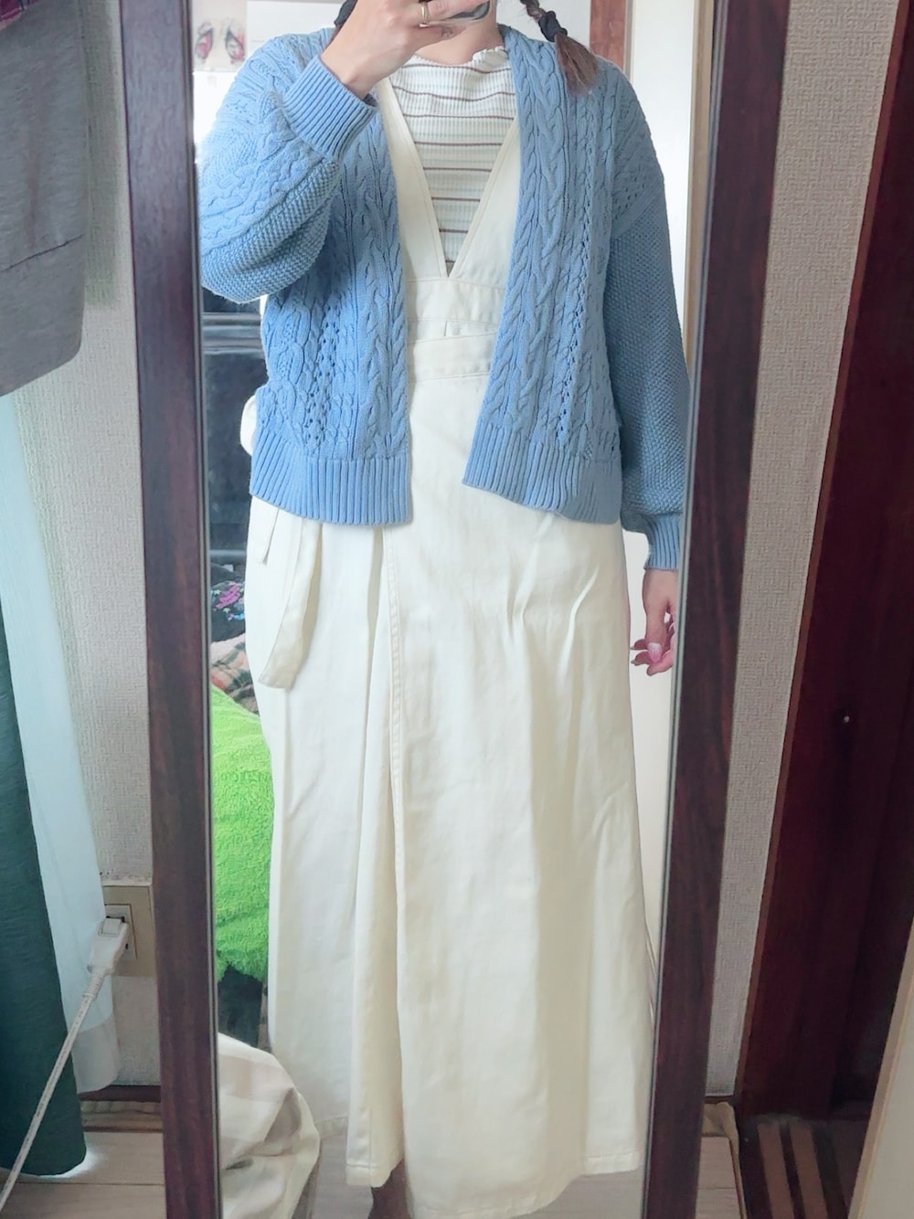 #デニムジャンスカ #メローTシャツ #ケーブル編みカーディガン