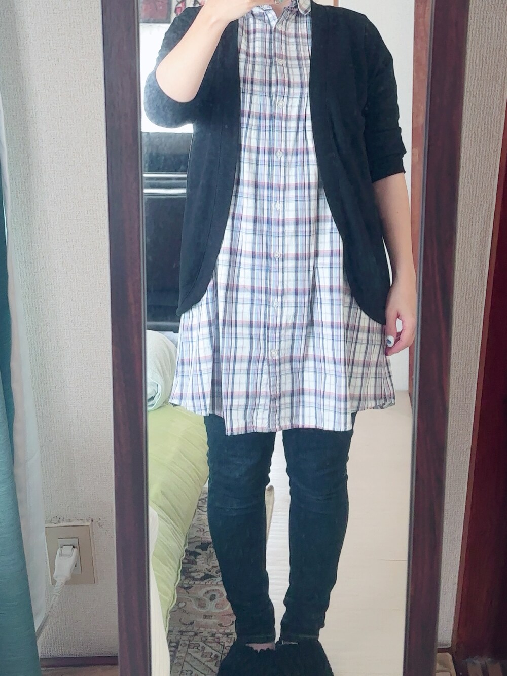 #デニムスキニーパンツ #チェックシャツワンピース #ラウンドカーデ