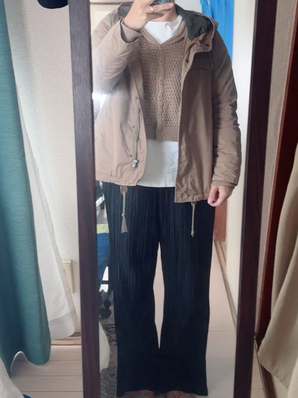 #プリーツパンツ #バックプリントTシャツ #襟付きニット #ミリタリージャケット