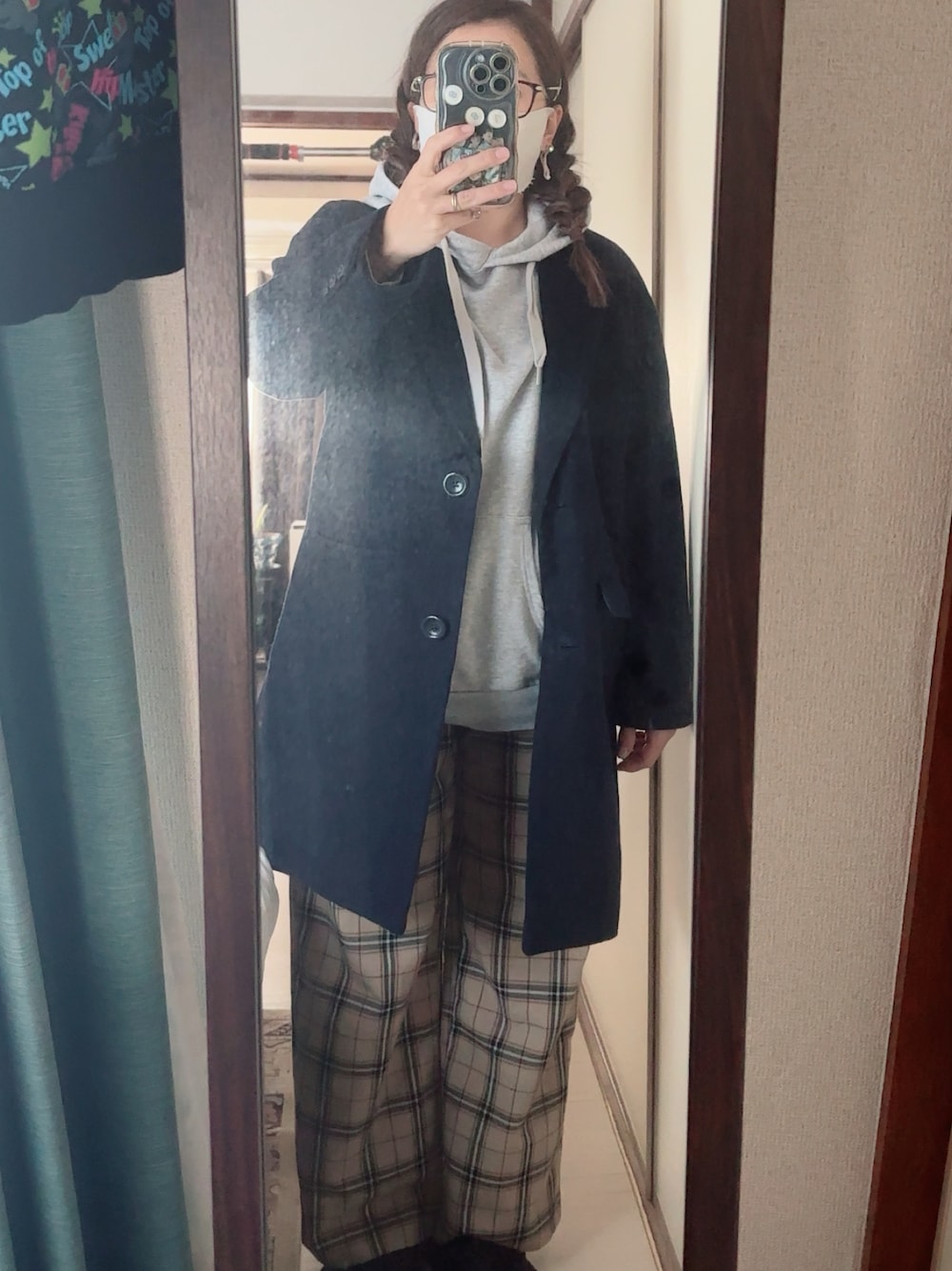 #チェックストレートパンツ #ゆるパーカー #チェスターコート