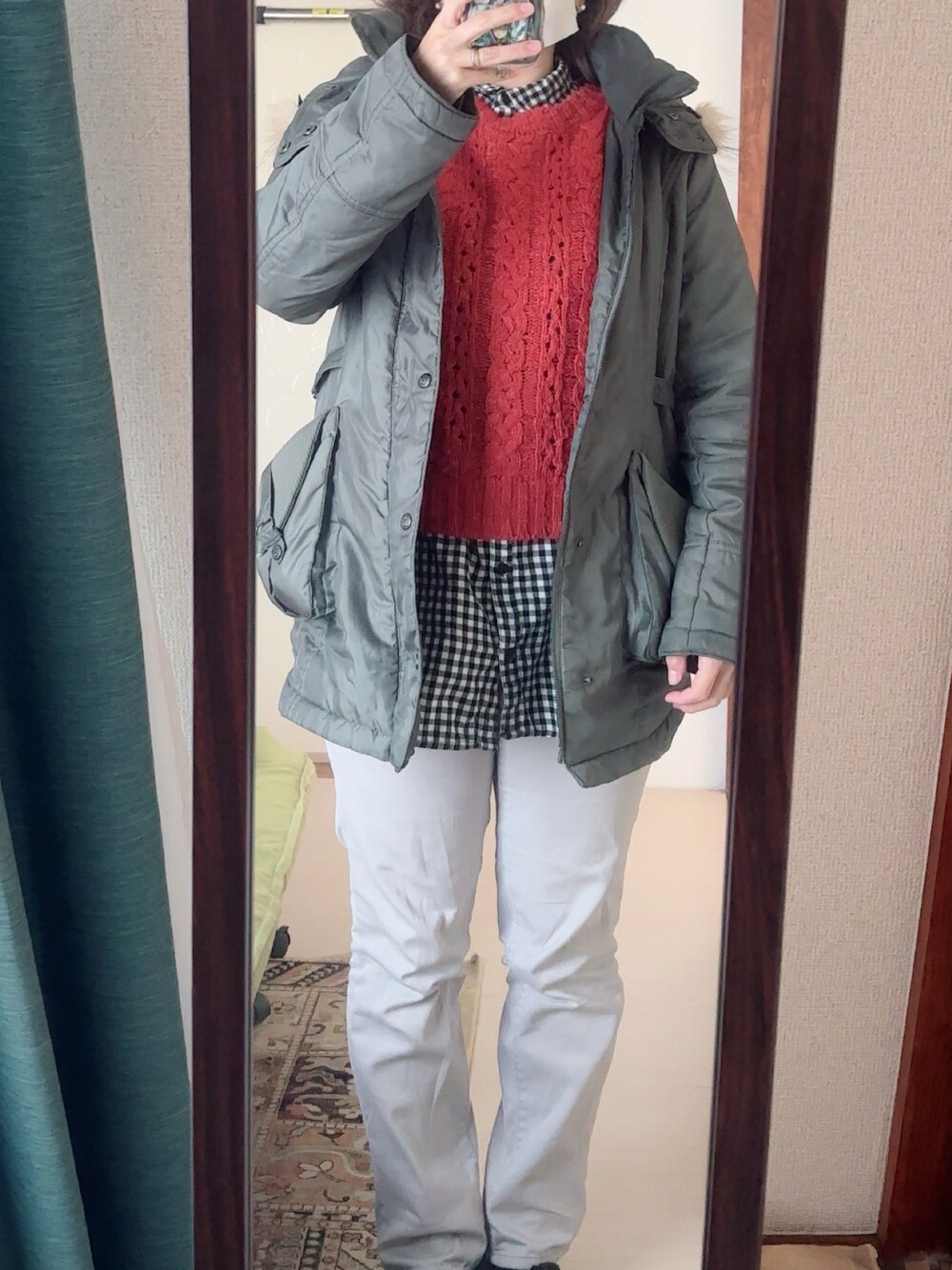 #カラースキニーパンツ #チェックチュニックシャツ #ニット #ミリタリージャケット