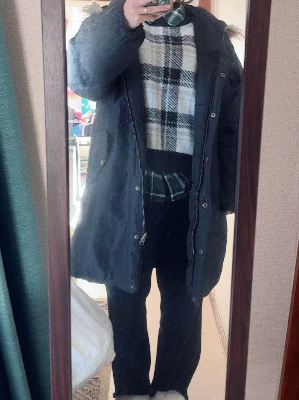 #すそメローパンツ #チェックシャツ #チェック柄ニット #リバーシブルミリタリージャケット