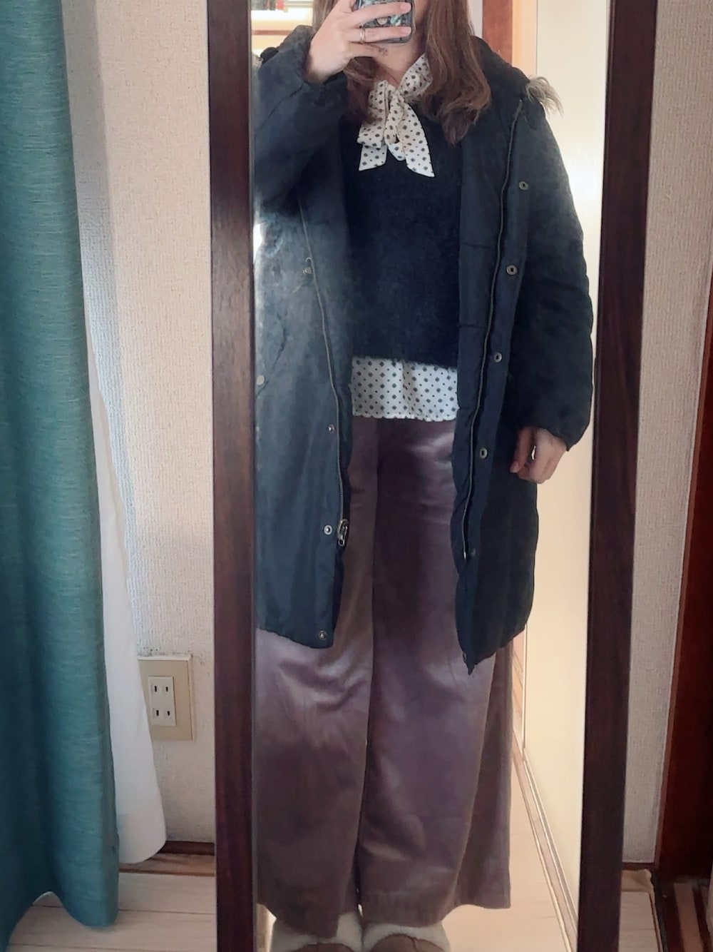 #ベロアパンツ #Vネックフェザーニット #ボータイブラウス #リバーシブルミリタリージャケット
