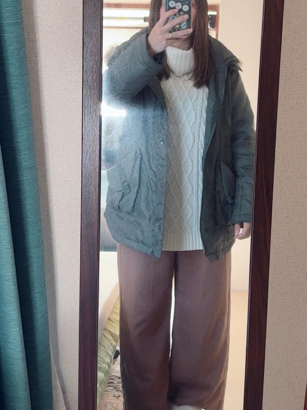 #8つ釦ストレートパンツ #オフタートルニットワンピース #カーキミリタリージャケット