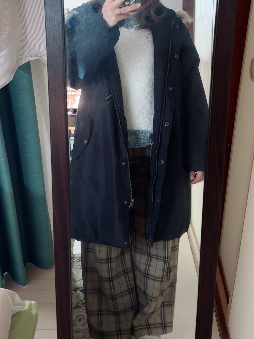#チェックストレートパンツ #Vネックニットプルオーバー #ハイネックブラウス #リバーシブルミリタリージャケット
