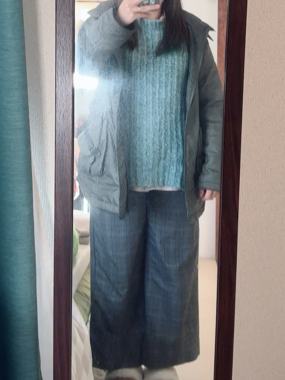 #グレンチェックワイドパンツ #ニットチュニック #カラーシャツ #ミリタリーコート
