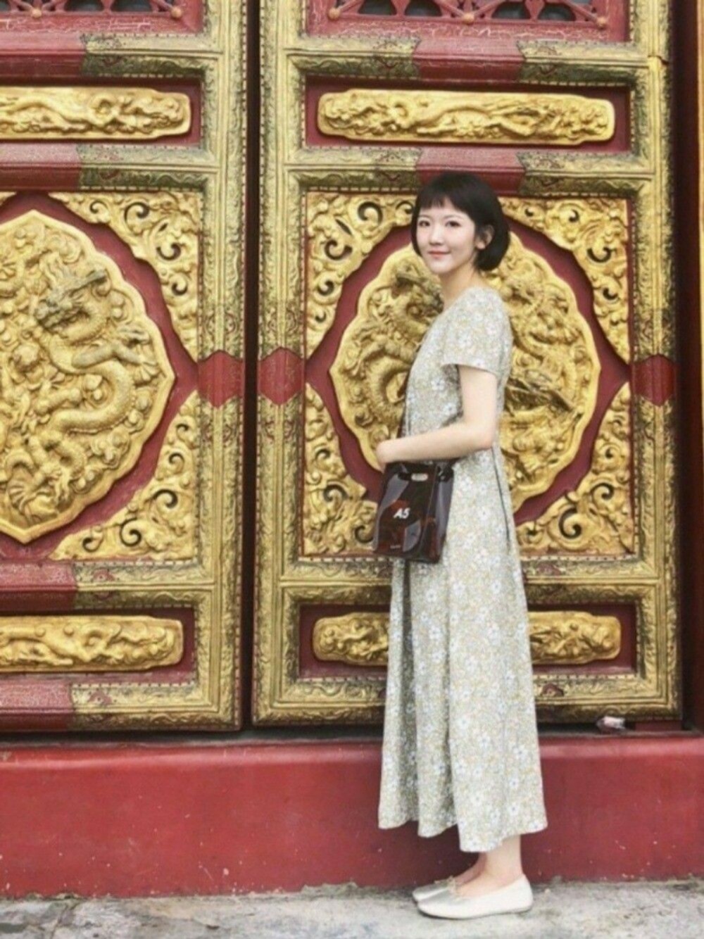 在北京故宮某個門前照的,那裏真的人超級無敵多,而且好大呀! 外出旅遊拿了連衣裙卻忘了拿腰帶,好在這條是自己有些收腰的設計,就不會太桶。話說背這種包真的很沒安全感XD