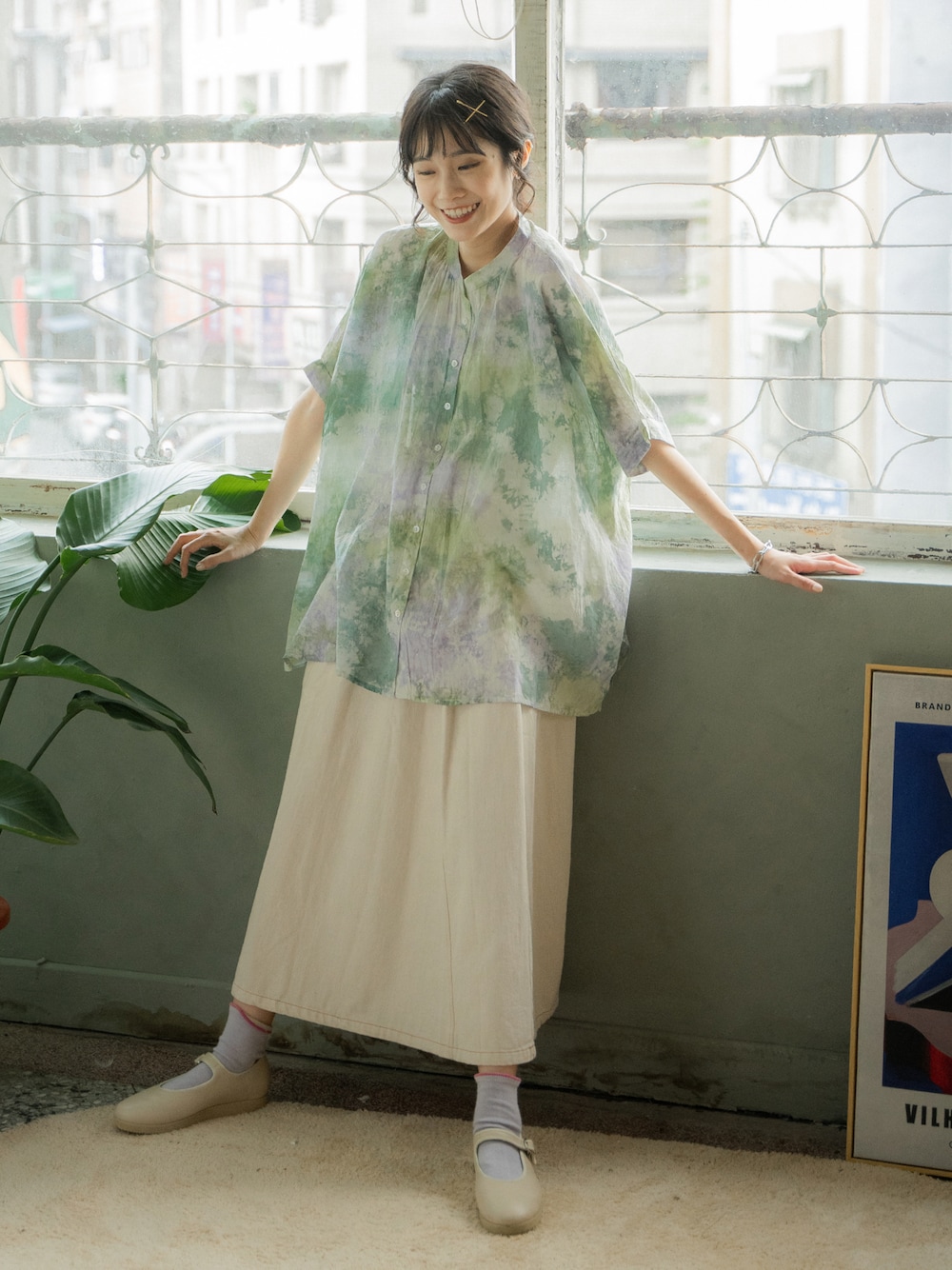 グリーン系のシャツ/ブラウス、ベージュ系のスカートを着用したレディースの秋コーディネートの1枚目の写真
