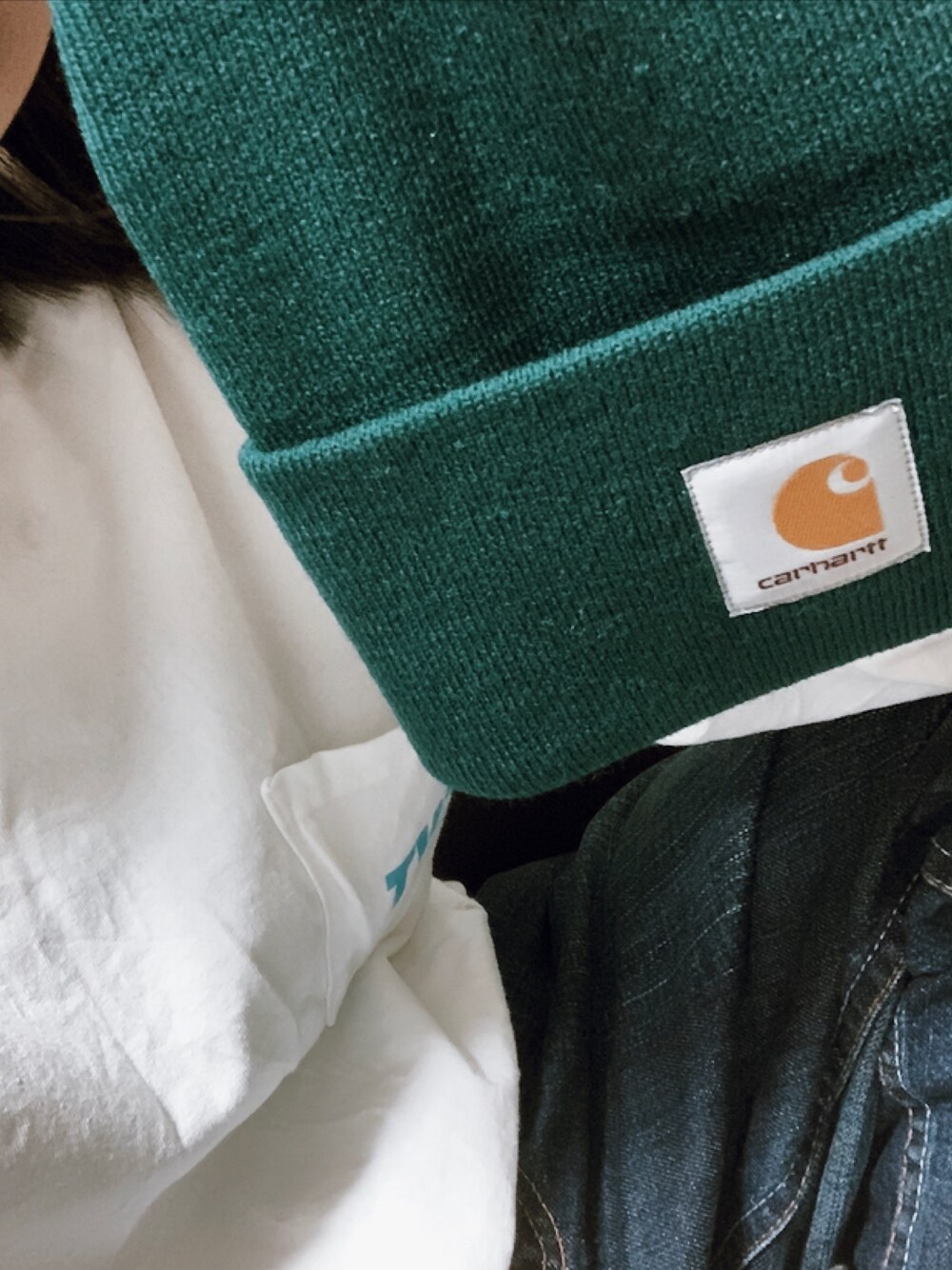 グリーン系のニットキャップ/ビーニーを着用したレディースの冬コーディネートの1枚目の写真